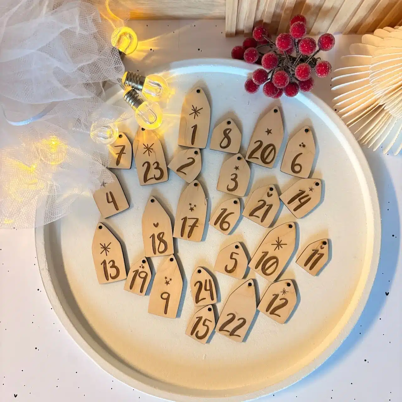 Mit unserer Adventskalender Zahlen Laserdatei gestaltest du ganz einfach individuelle Anhänger für deinen Adventskalender. Das Design ist farblich nach Laserschnitt und Gravur markiert, sodass das Lasern besonders leicht und präzise gelingt.