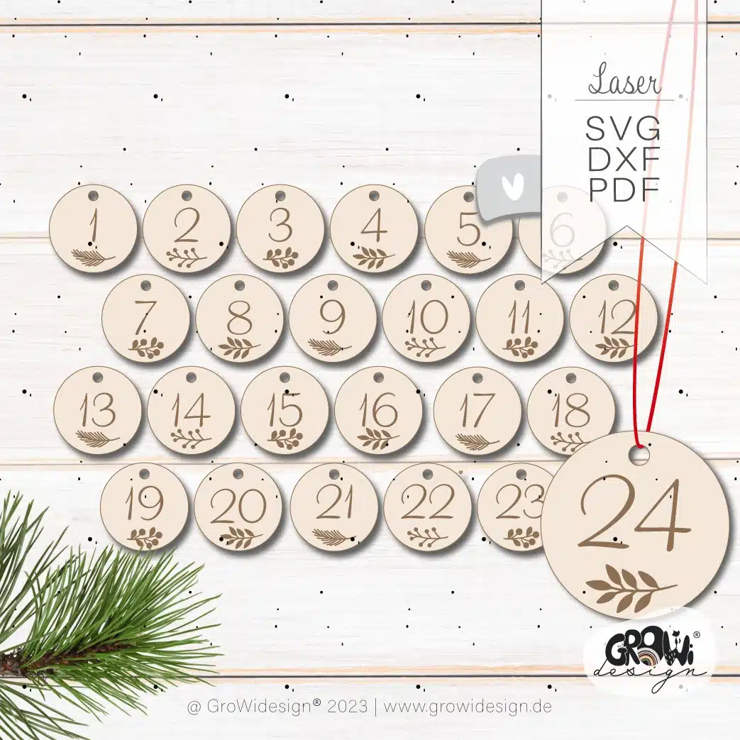 Adventskalender Zahlen Laserdatei – Gestalte deine eigenen Adventskalenderzahlen aus Holz und befestige sie ganz einfach an deinem selbstgemachten Kalender. Die 24 Zahlen verzaubern mit vier wiederkehrenden floralen Verzierungen. Flexible Befestigung dank Bändern, Schnüren oder ähnlichem. So bleiben sie jedes Jahr wiederverwendbar. Perfekt für jeden Advent.