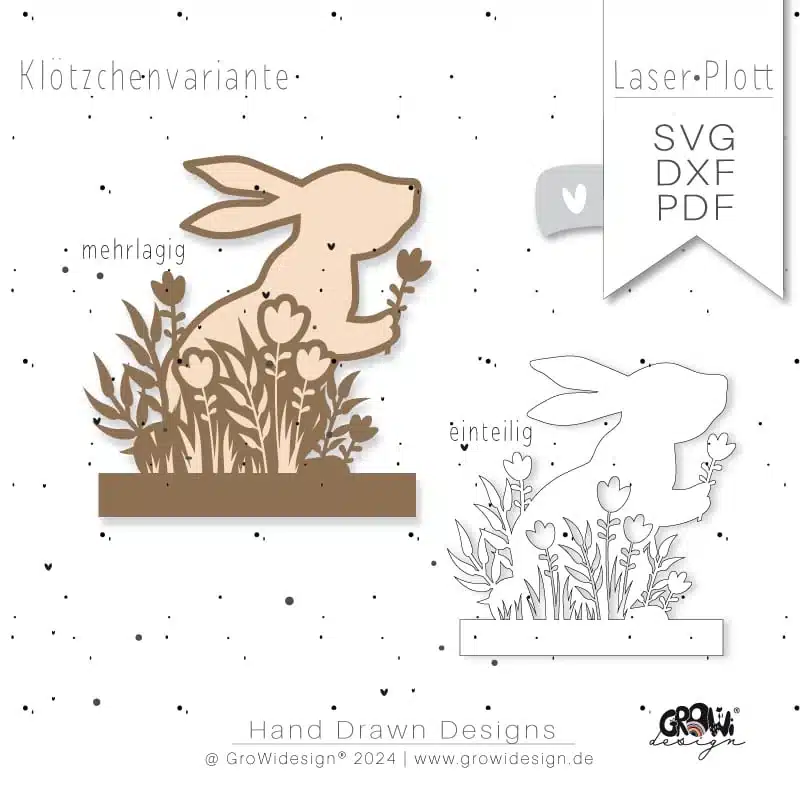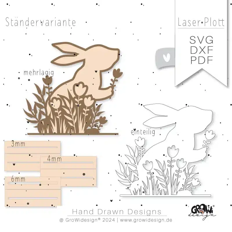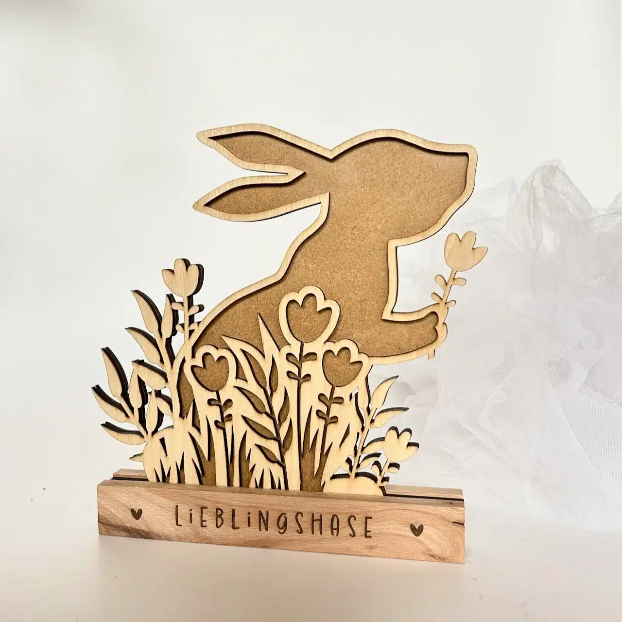 Erstell dir deinen Lieblingshase! Unser wunderschöner Blumenhase ist in unterschiedlichen Versionen laserbar. So kannst du ihn in einer Ebene erstellen oder auch mit einer zusätzlichen Konturebene, welche ihm ein 3D Effekt gibt. Dazu kannst du zwischen 2 Haltevarianten auswählen. Der blumige Hase ist perfekt für deine Tischdekoration, auf einem Regal, im Osternest und auch wunderschön als kleines Geschenk.