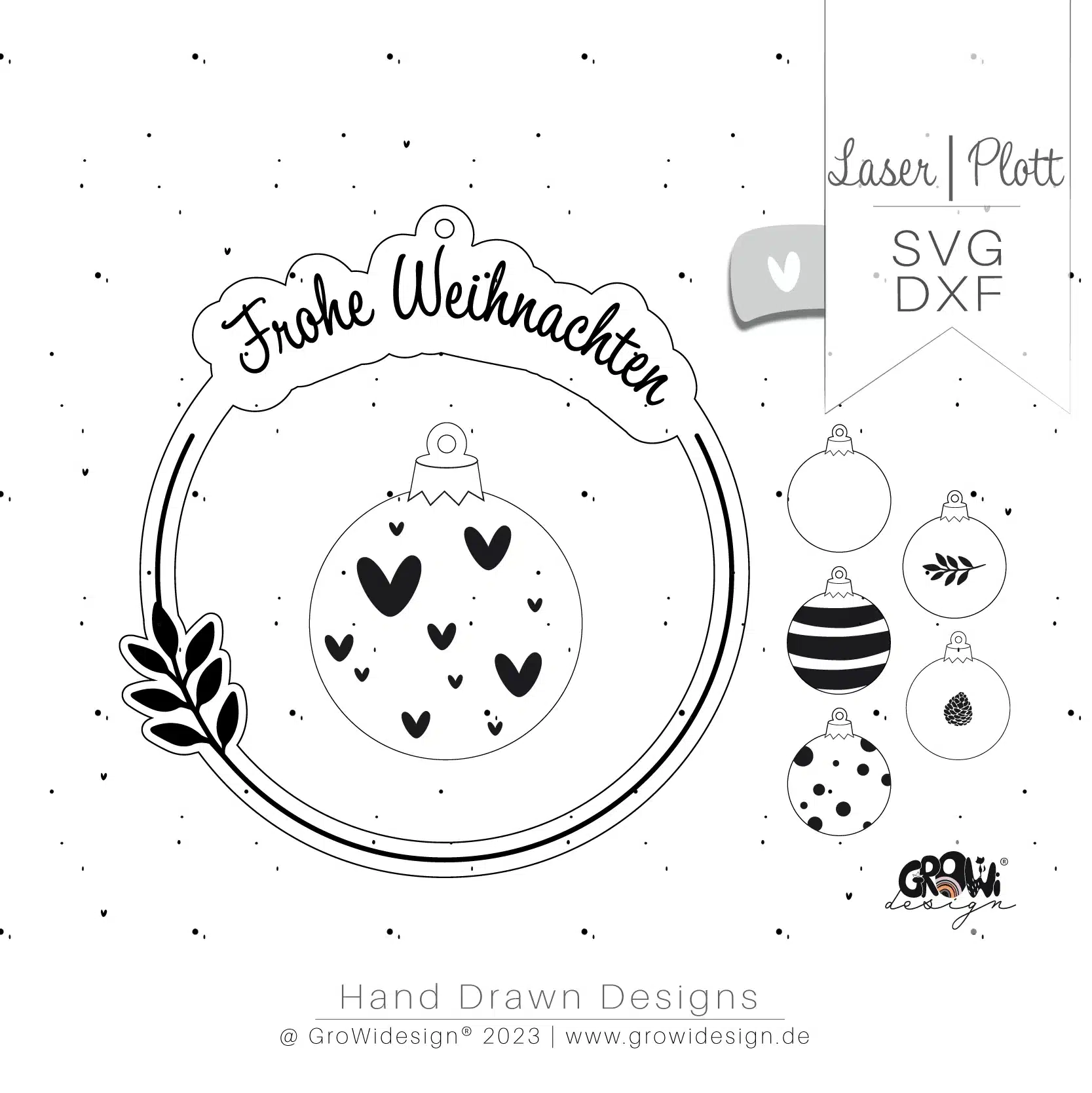 Gestalte dir mit unserer wunderschönen Frohe Weihnachten Laserdatei deine individuelle Dekoration für die Weihnachtszeit. Du kannst den Kranz vielseitig verwenden. So kannst du ihn einzeln oder in Verwendung mit einer Kugel gestalten. Die Weihnachtskugeln kannst du aber auch ganz nach deinem Belieben einzeln z. B. als Geschenkanhänger verwenden.