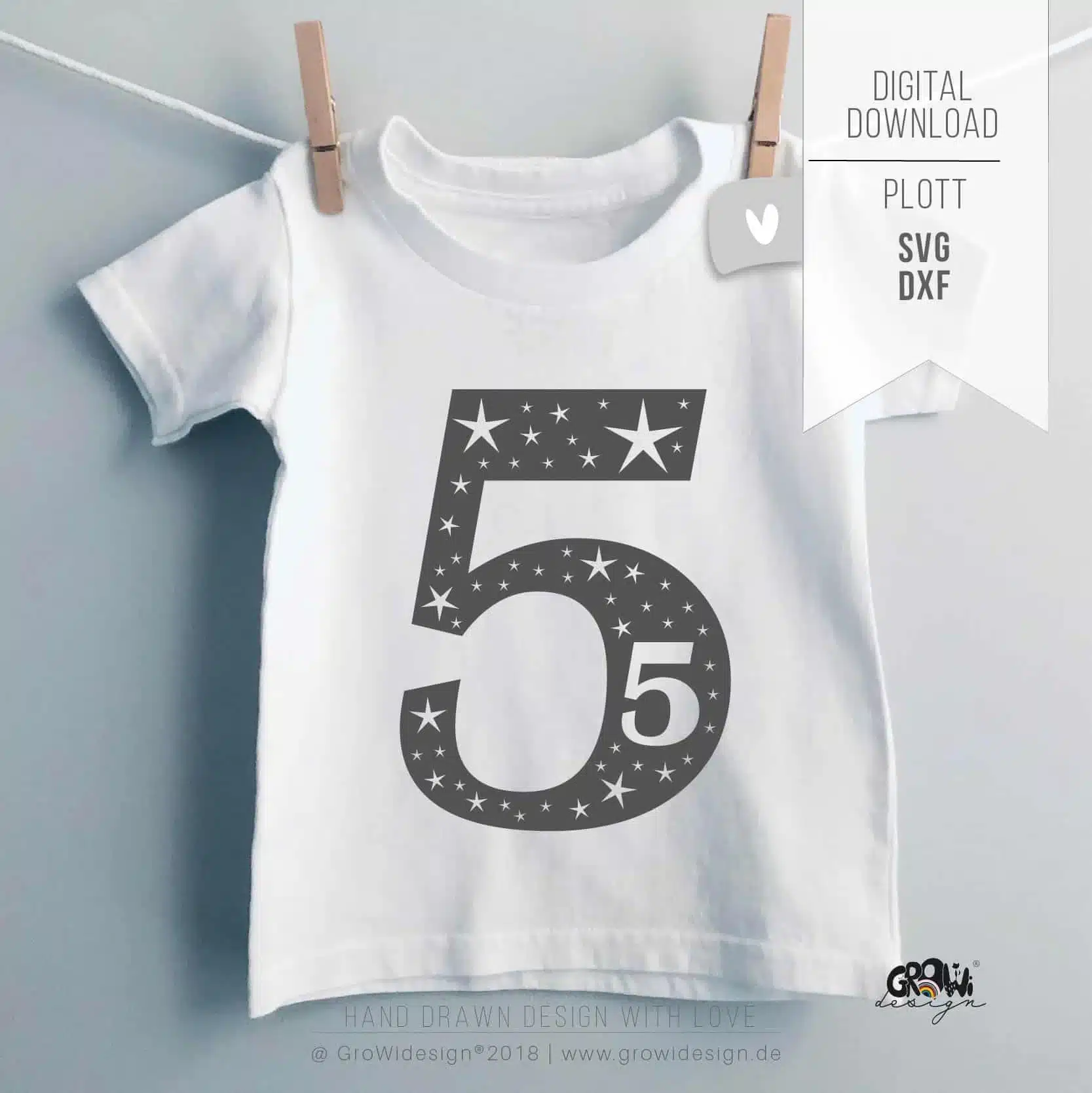 Ein Geburtstagsshirt ist ein absolutes MUST HAVE für jedes Geburtstagskind. Mit dieser Plotterdatei kannst du eine tolle Zahl 5 erstellen. Gestalte sie einfarbig oder auch mit farbigen Sternen. Ganz nach deinen Wünschen. Lass Kinder Augen erstrahlen!