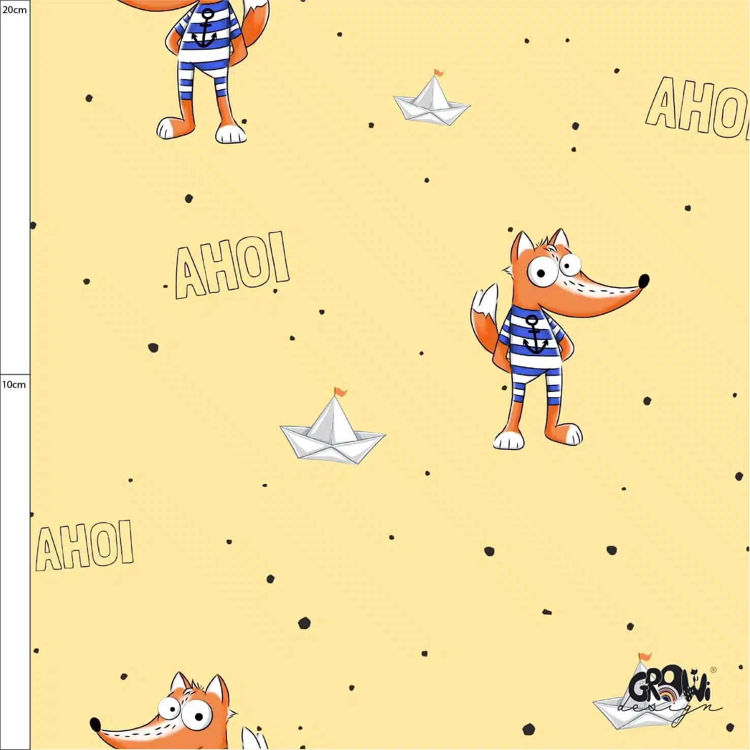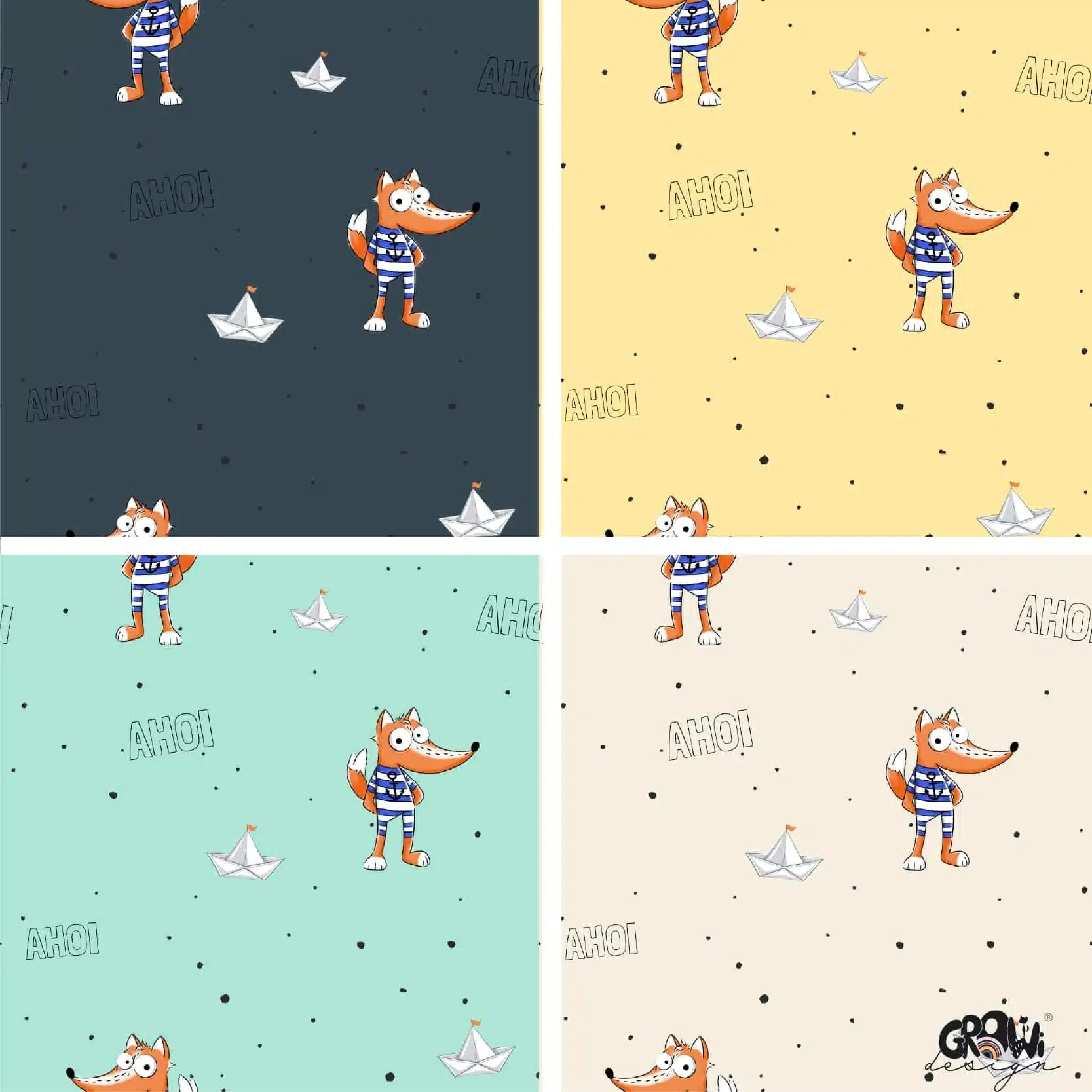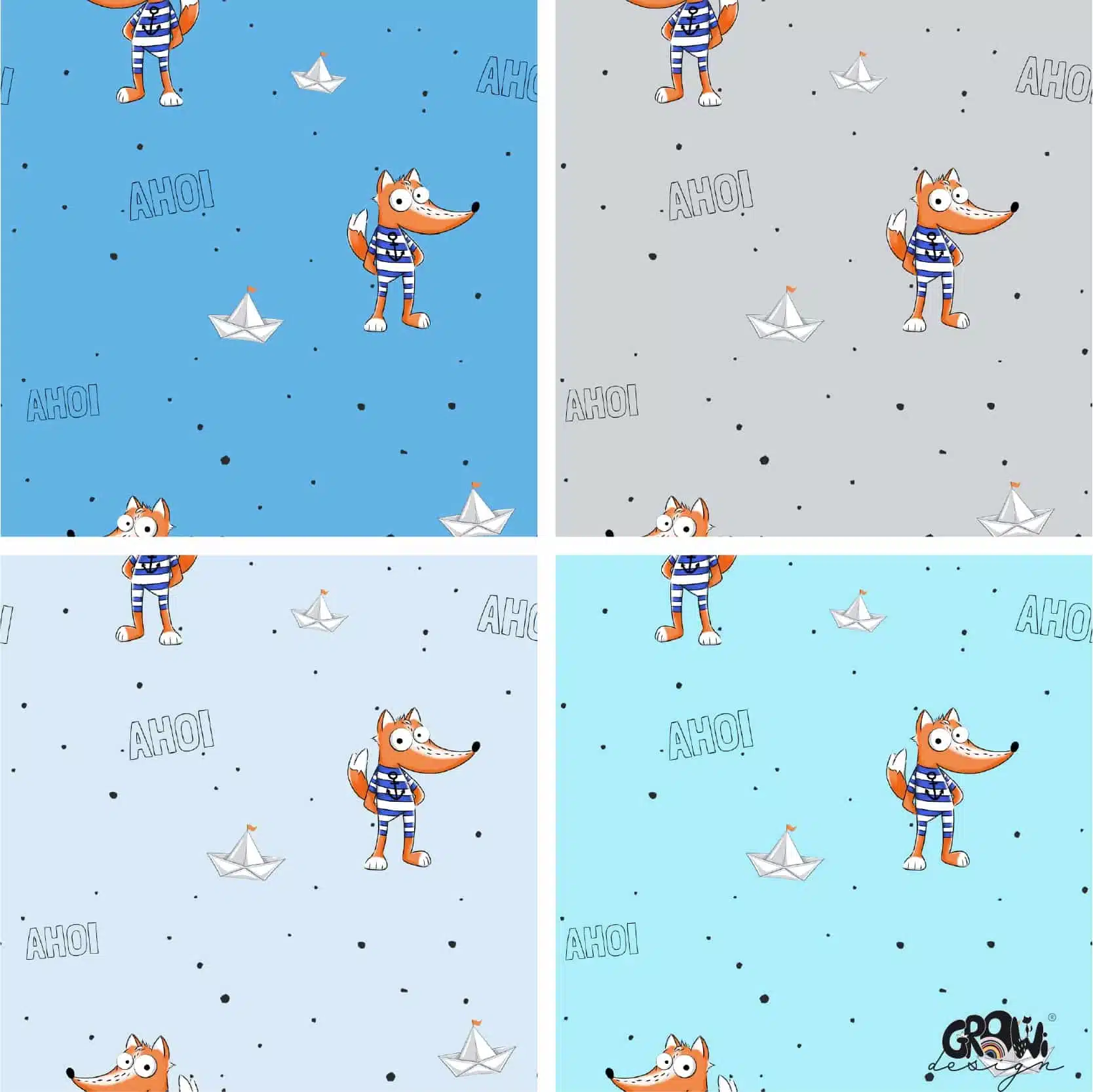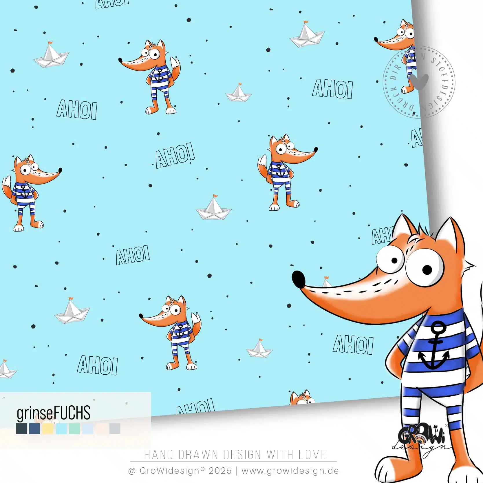 Druck dir deinen Stoff mit unsrem coolen grinseFUCHS AOP Stoffdesign! Das Design ist in 8 Farbstellungen erhältlich. Die Farben sind in RGB gehalten und der Rapport misst 20cm x 20cm. Passend zu unserem handgezeichneten grinseFUCHS AOP Stoffdesign findest du in unserem Shop auch das passende Panel Design.