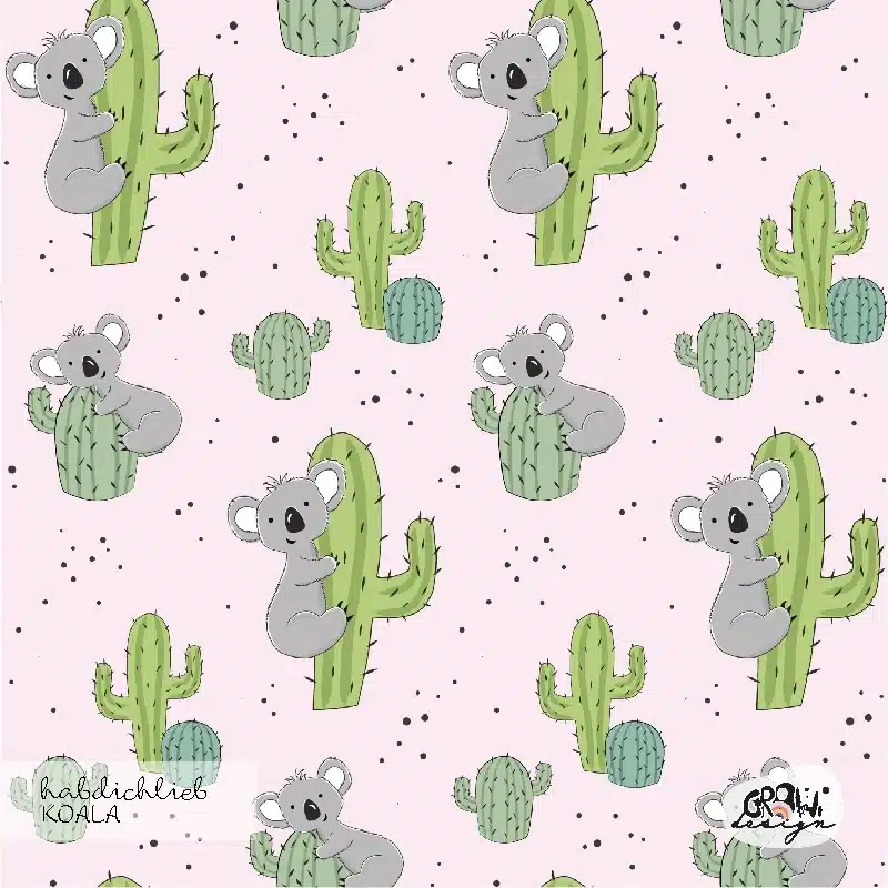 Unser entzückendes habdichlieb KOALA seamless Stoffdesign ist perfekt für Klein & Groß. Liebevoll umarmt der kleine Koala mit seinen Kulleraugen den stacheligen Kaktus. Dieses kindgerechte Muster eignet sich perfekt als Stoff- und Papierdesign für Kinderkleidung, Bettwäsche, Geschenkpapier und vieles mehr. Zarte Pastelltöne wie mintgrün, zartrosa und sandbeige verleihen dem Design eine beruhigende Wirkung.