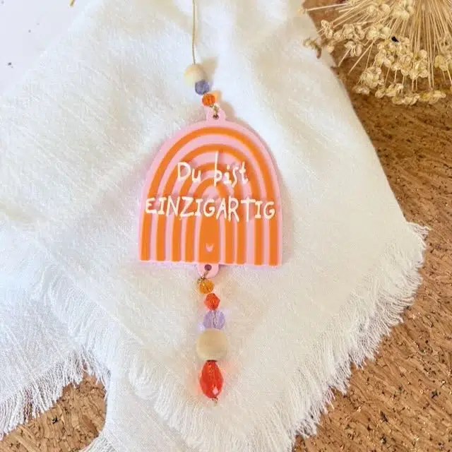 Hol dir unsere Regenbogen einzigartig 3D Druckdeatei und erstele dir liebevolle Anhänger mit dem Schriftzug „Du bist einzigartig“. Wunderschön gestaltbar mit Glitzersteine als Sonnenfänger, mit Holzperlen als Geschenkanhänger und vieles mehr. Perfekt als kleines Geschenk zum Geburtstag, Taufe und einfach so.