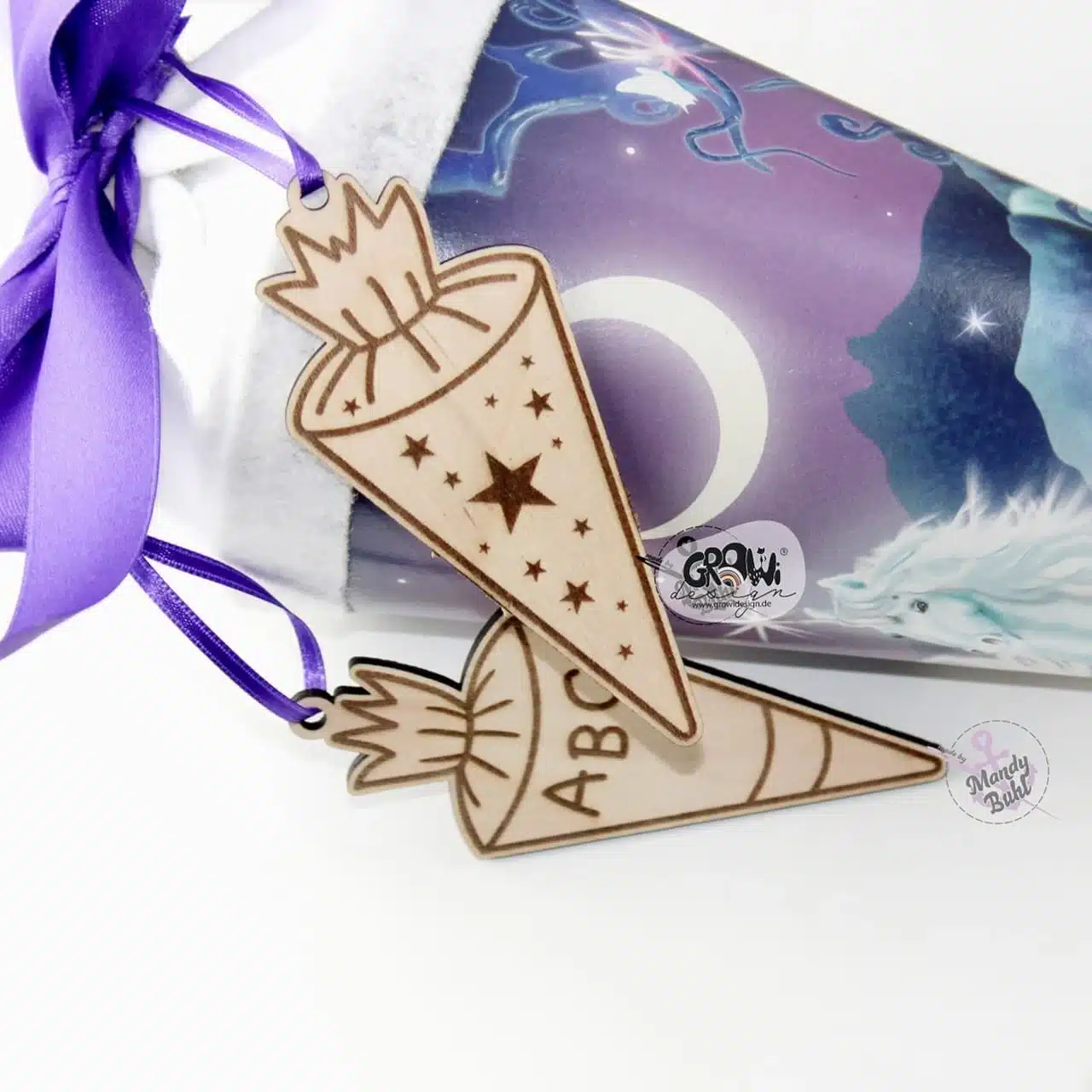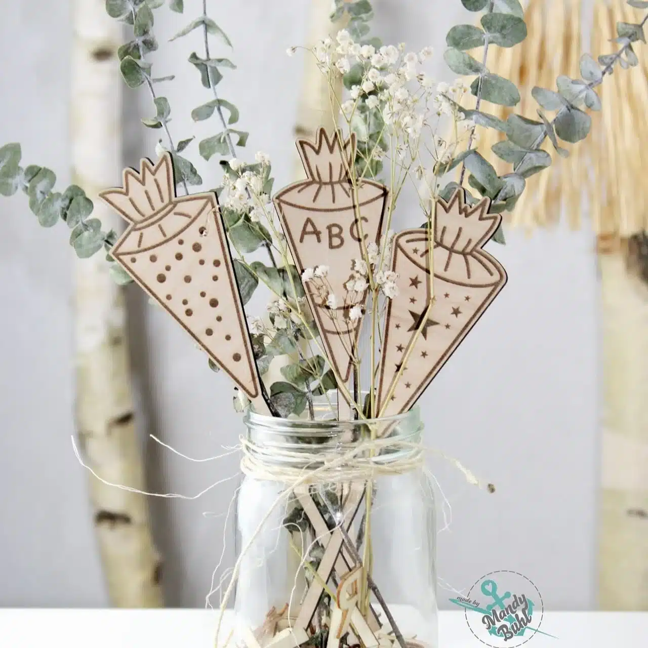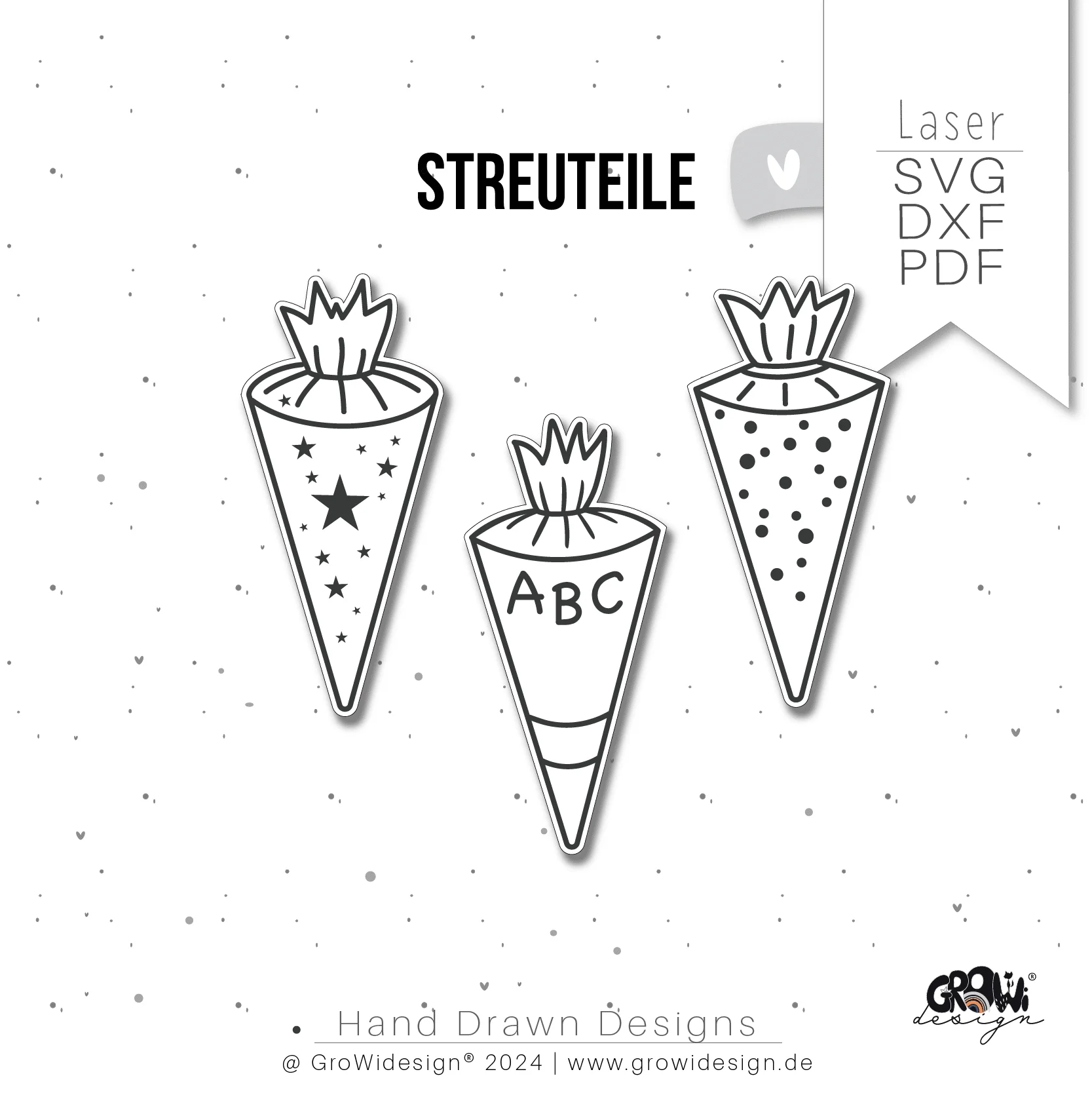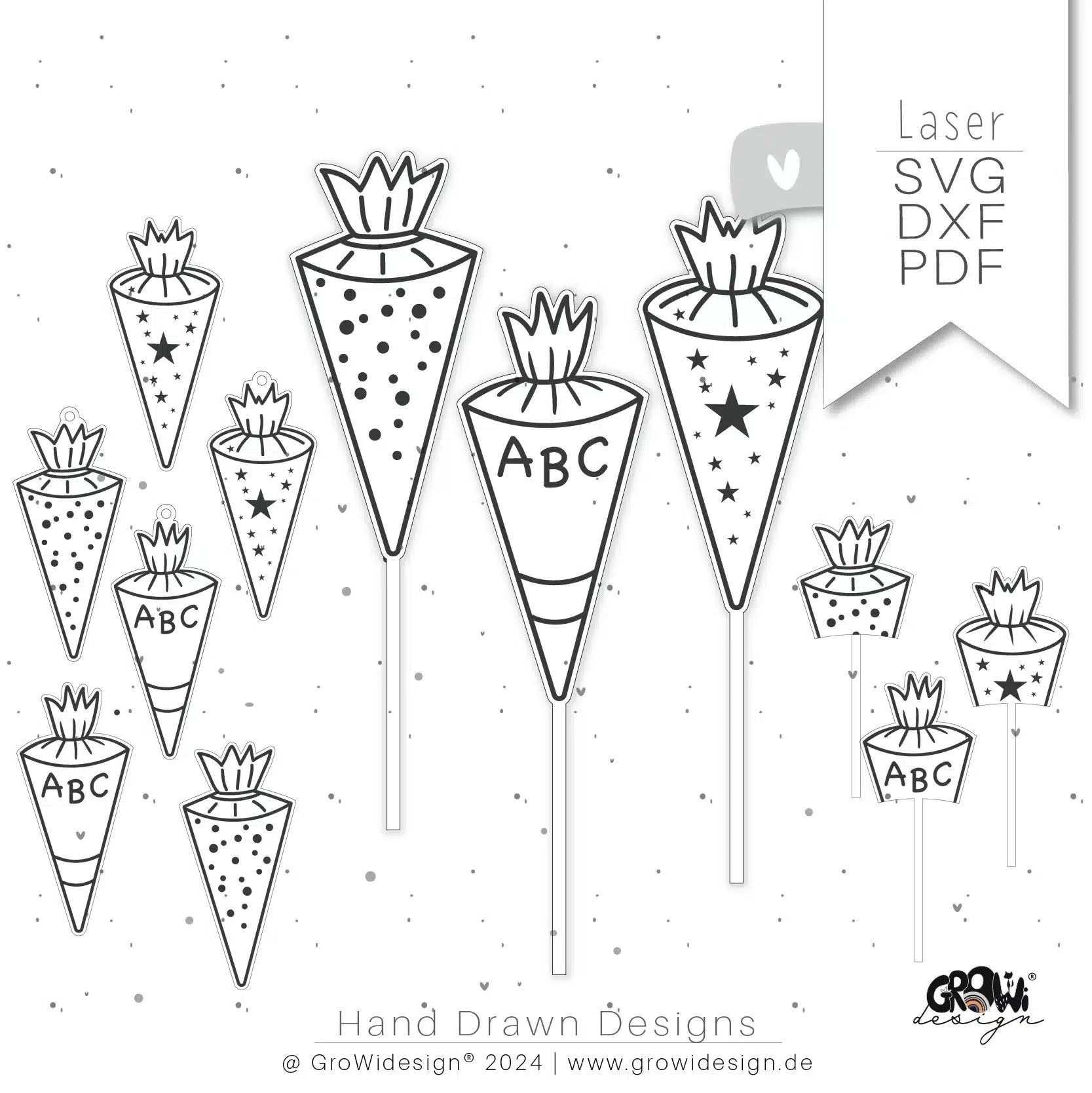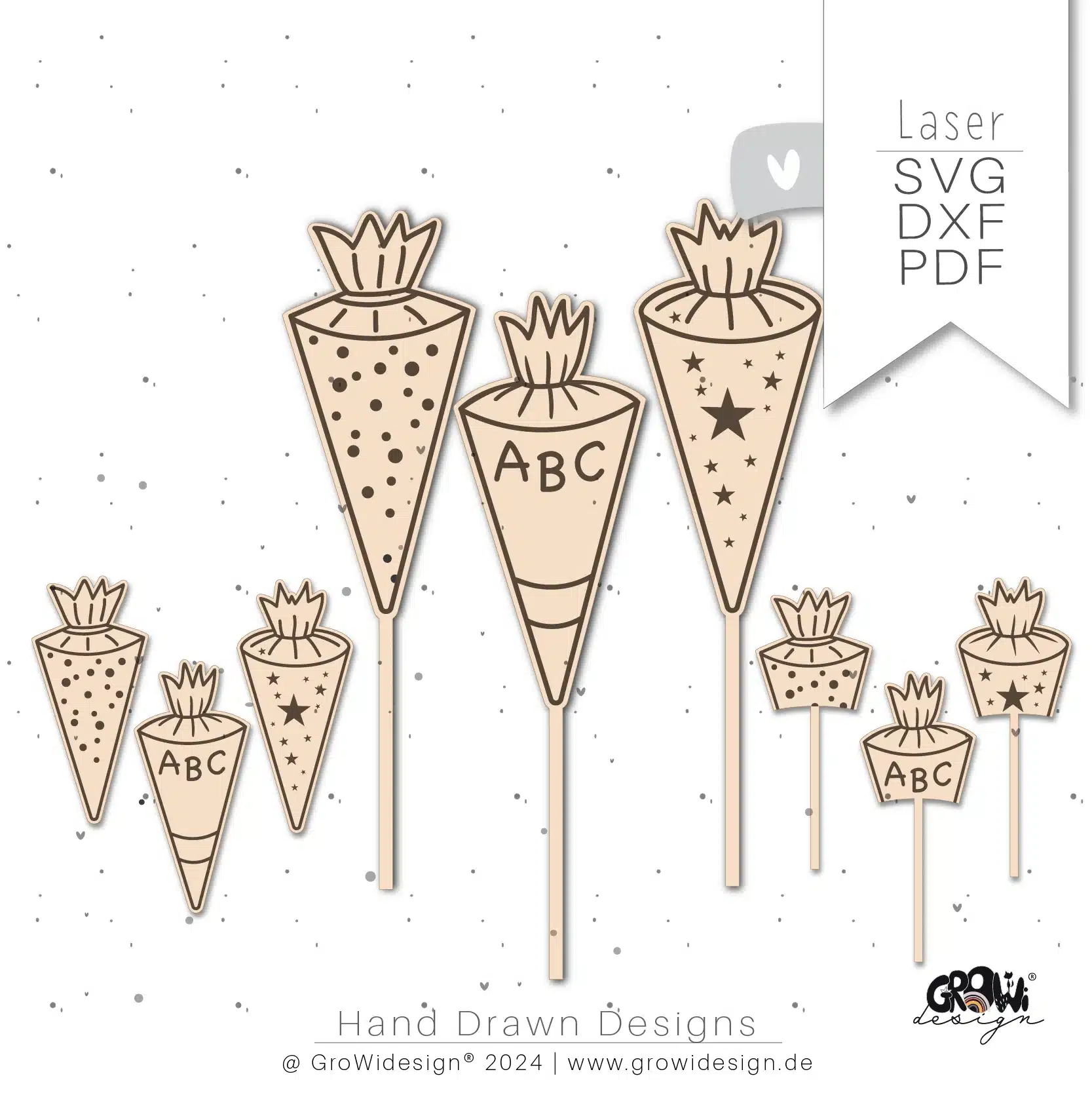 Eine wunderschöne Dekoration für den großen Tag, die Schuleinführung. Mit dieser Laservorlage kannst du Dekospieße fr den Kuchen und Muffins erstellen. Kleine Schultütenanhänger für die Schultüte erstellen, sowie Streuteile für den Tisch und hübsche Karten verzieren.