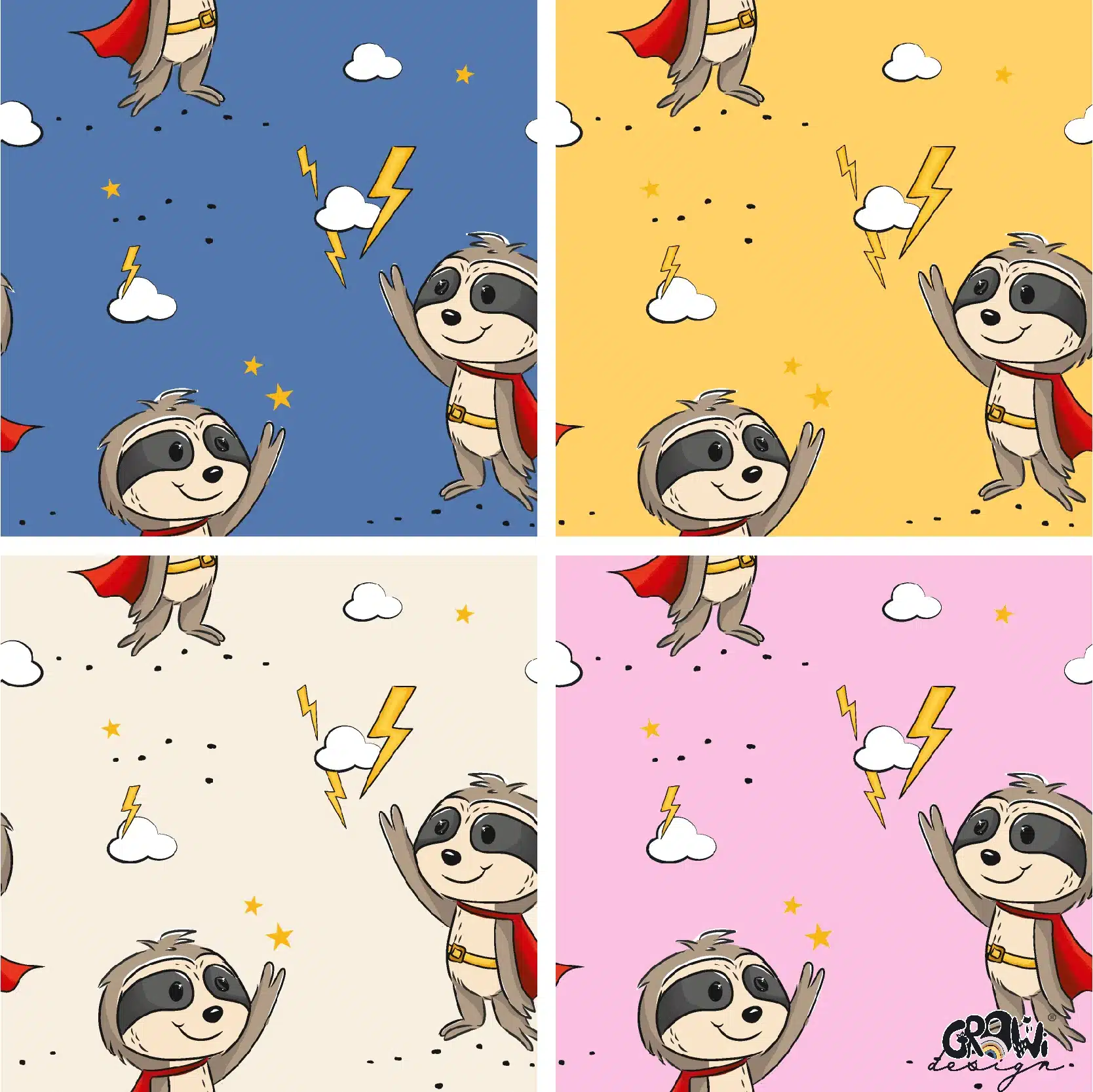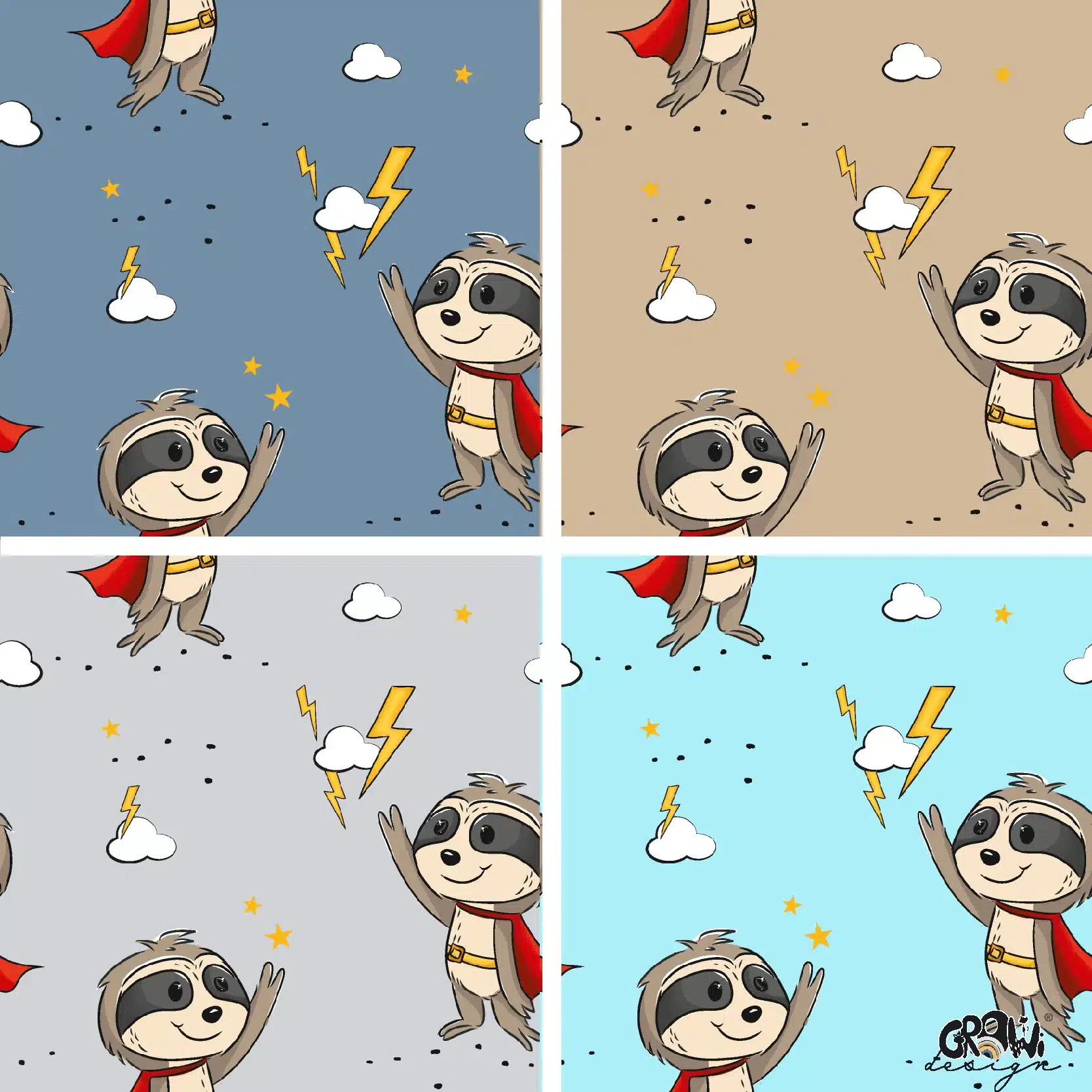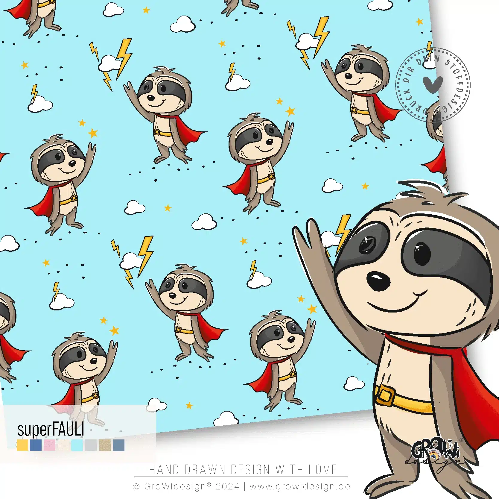 Entdecke unser handgezeichnetes superFAULI Stoffdesign und druck dir deinen Stoff. Das Design ist in 8 Farbstellungen erhältlich. Die Farben sind in RGB gehalten und der Rapport misst 15cm x 15cm.