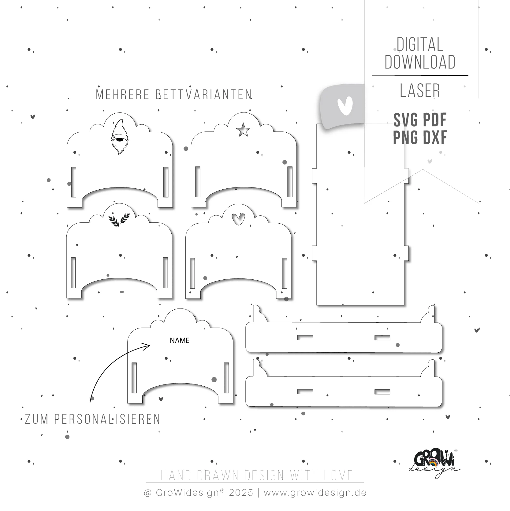 Das Laserset bietet dir mehrere Gravuroptionen für das Bett und lässt sich optional personalisieren, damit dein Wichtelset ganz einzigartig wird.