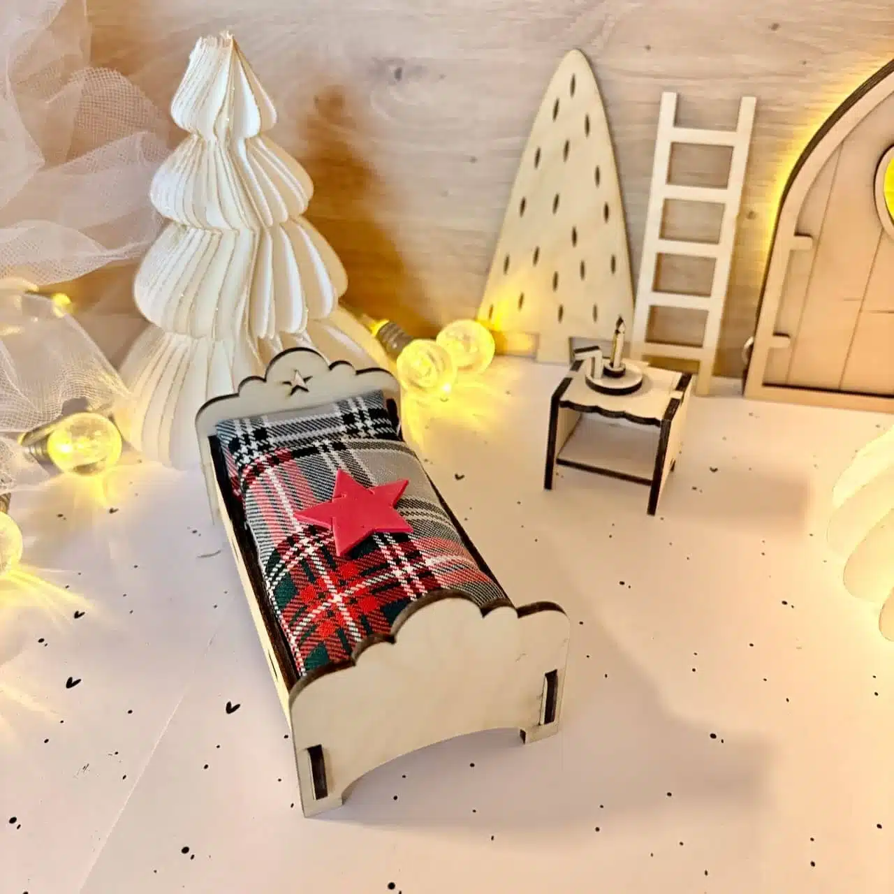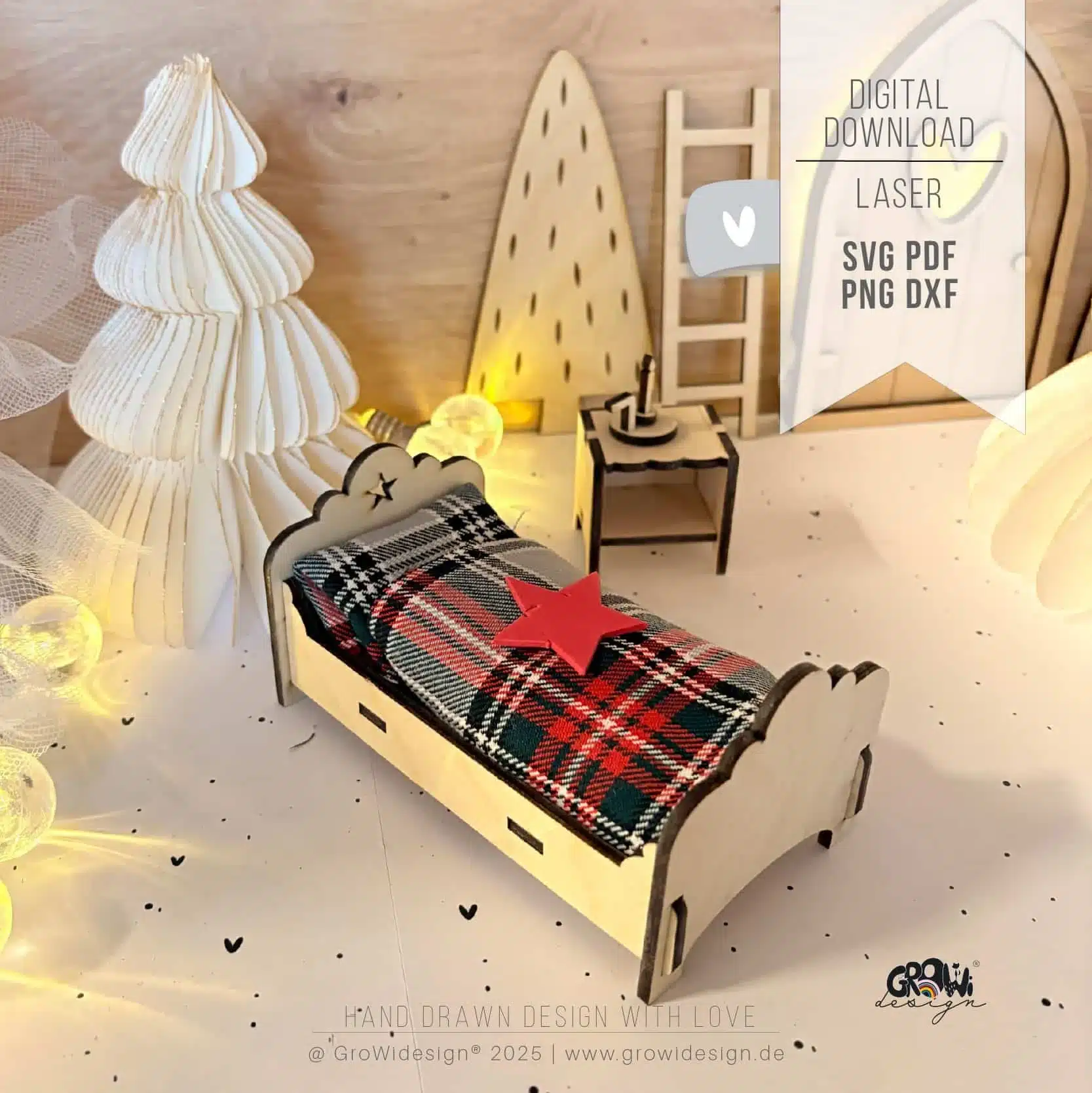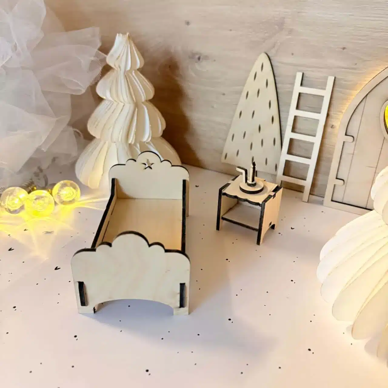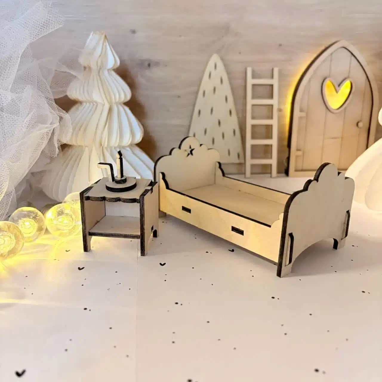 Ergänze deine Wichtelwelt mit unserer liebevolle gestalteten Laservorlage. Ein Bett zum Reinkuscheln, ergänzt durch einen kleinen Nachttisch und eine Kerze. Perfekt für alle kleinen Wichtelfans.