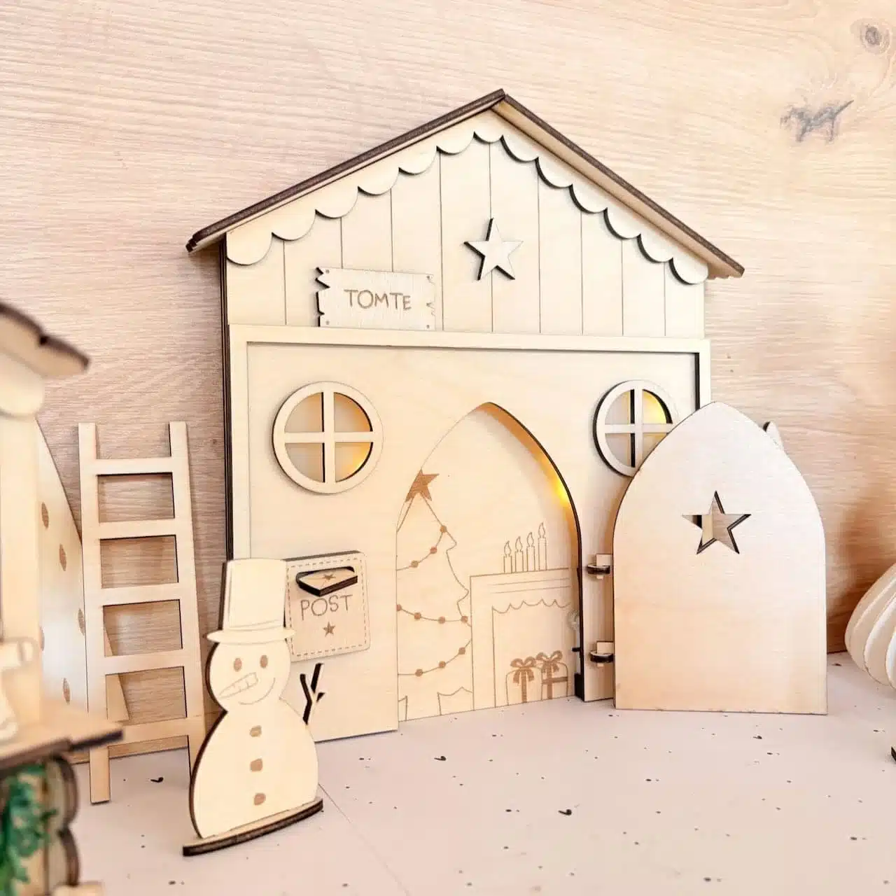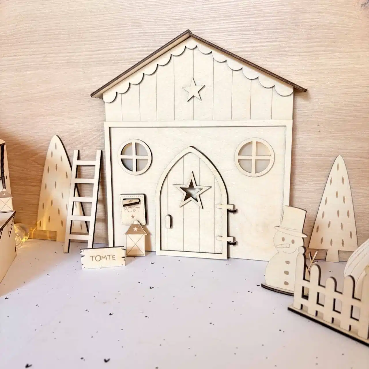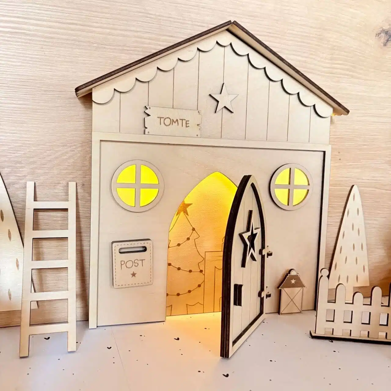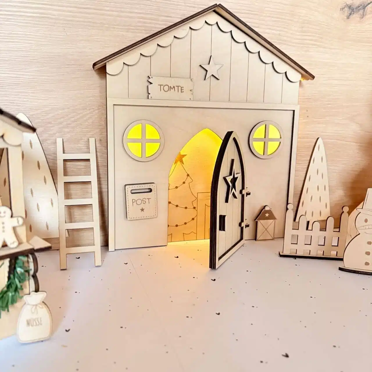 - Zubehör: 2 Tannenbäume, Schneemann, Gartenzaun, Laterne, Tomte Schild und Postkasten mit Briefe